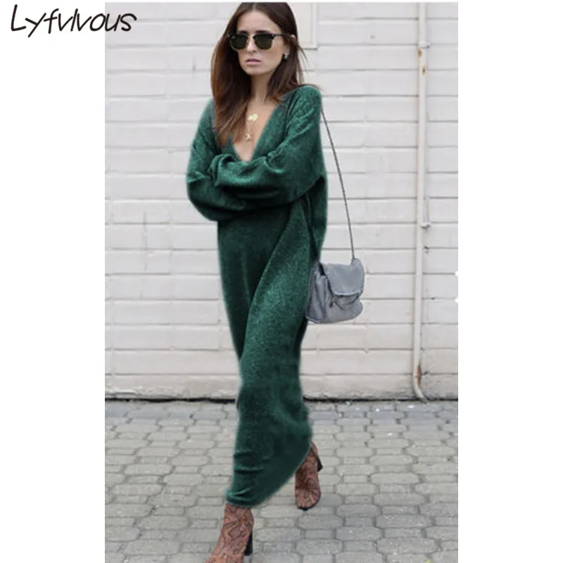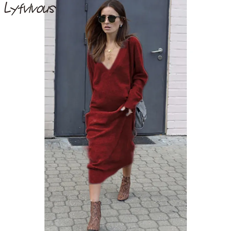 Achat Meilleur Femmes NOUVEAU Automne Hiver Robe Longue Lady Knit V cou Lâche Tricots Solide Streetwear Casual tempérament Chandail Robe pull femme Pas Cher Prix.