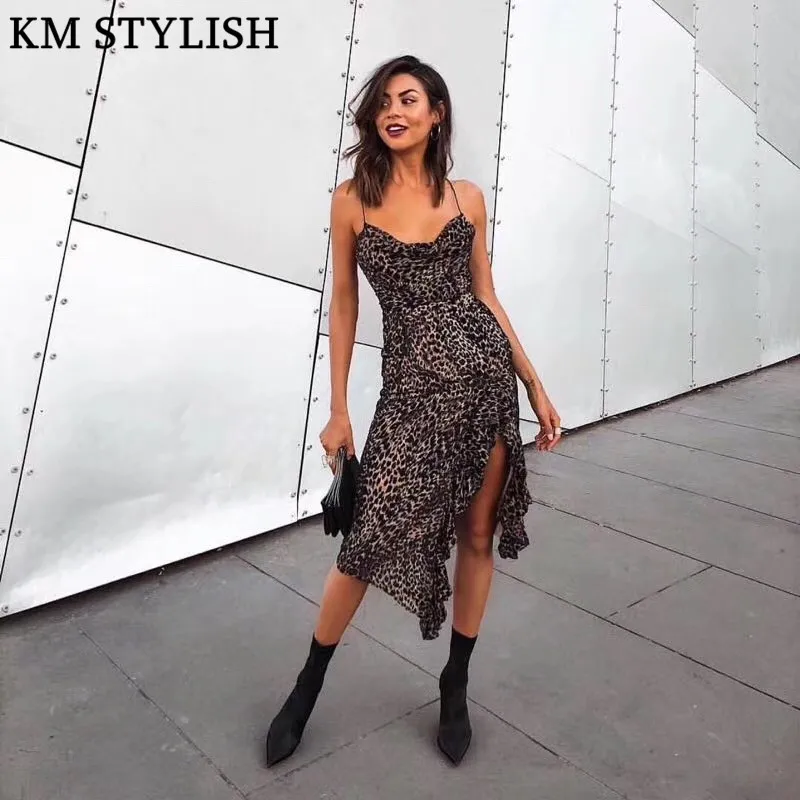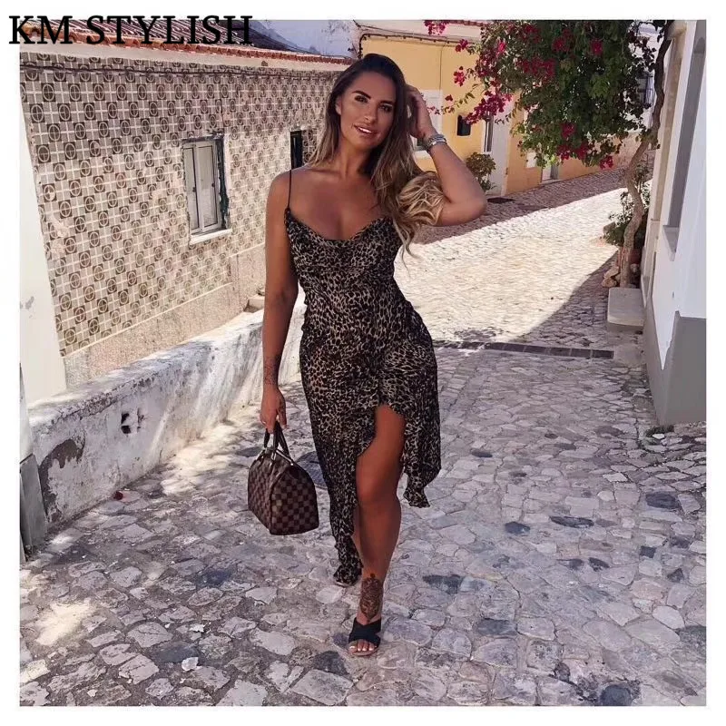 Vente Piste Texture Flocage Léopard Sauvage Taille Haute Irrégulière À Volants Parti Robe De Courroie de Gaine Fendue Sexy d une Seule pièce Robe Pas Cher En Ligne