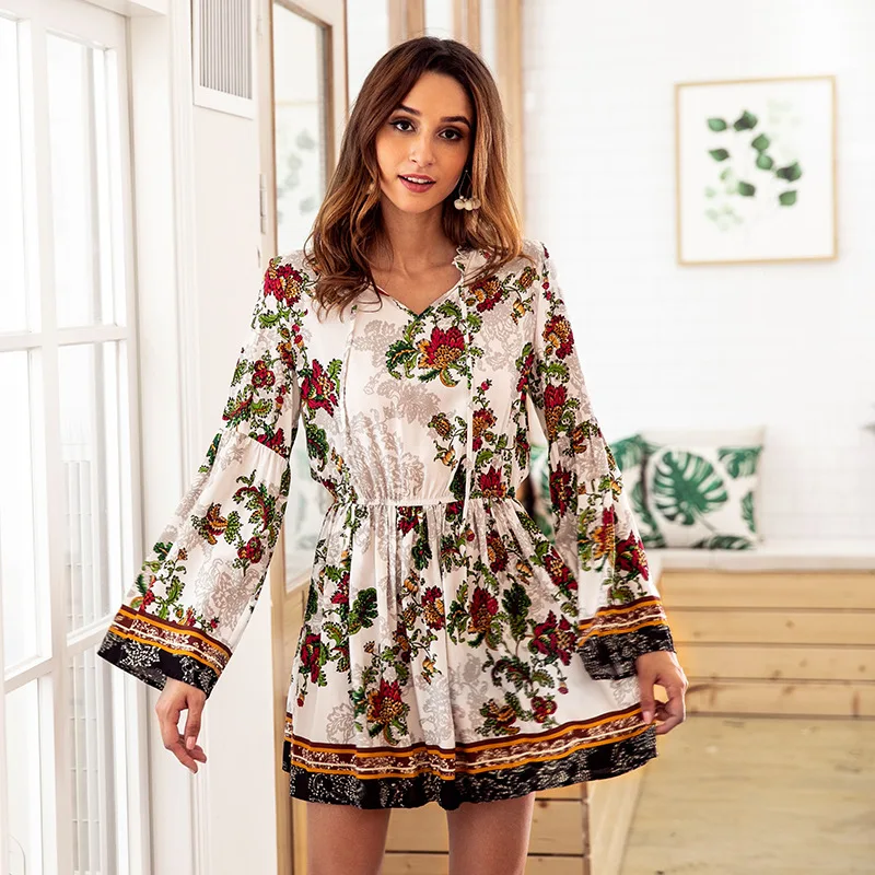 . Acheter Yovamoo Imprimé Floral Robe Automne Manches Longues Col V Vintage Élastique Taille Boho Vacances Bohème Robes Vetement Femme 2018 Pas Cher Prix.
