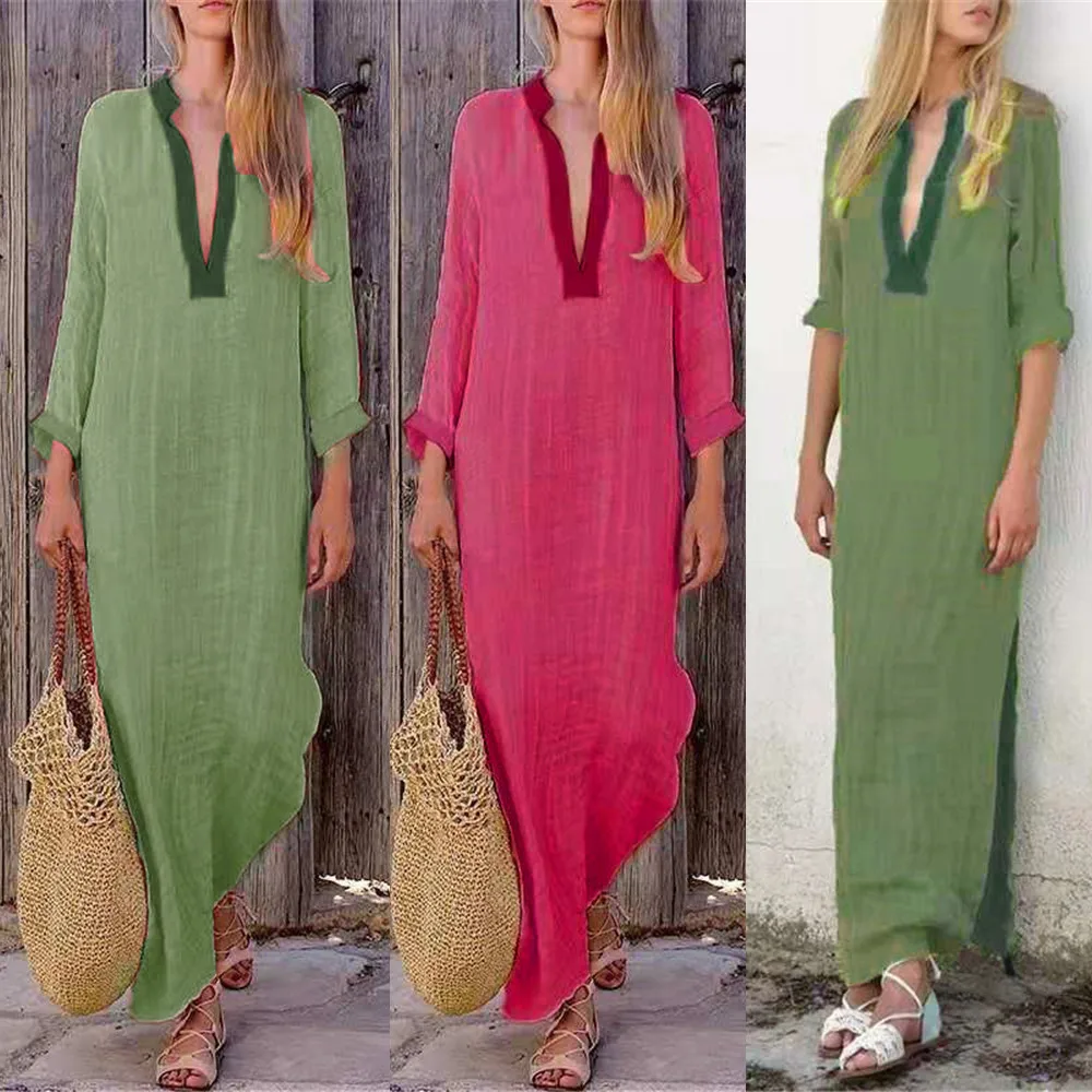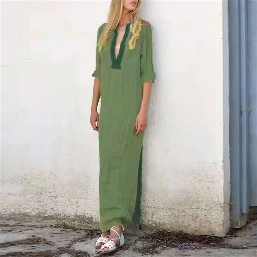 Achat Meilleur Mode Femmes Solide Col V À Manches Longues Ouvert Fourche Longue Ligne Droite Vintage Robe Pas Cher Prix.