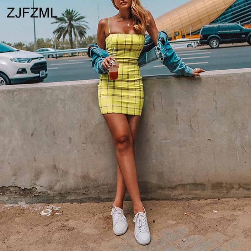Acheter Meilleur ZJFZML Sexy De Courroie De Gaine Bandage Robe 2018 Femmes Vert Plaid Imprimer Sans Manches Parti Robe D été Dos Nu Slim Fit Mini Robe Pas Cher Prix.
