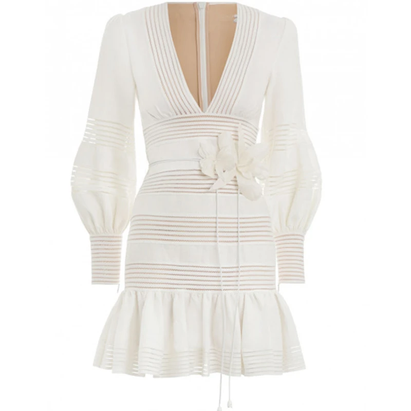 Vente Meilleur 2018 Automne Hiver Australie Zim Nouveau Blanc Lin Dentelle Découpe Bande V cou Mince À Manches Longues En Queue de poisson Robe Pas Cher Prix.