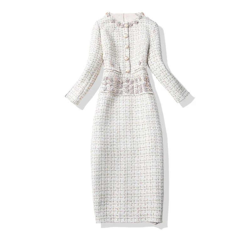 Achat Dames robe de mode tempérament rétro tweed col rond de luxe diamants mince mi longueur élégante robe automne et d hiver nouvelle Pas Cher En Ligne