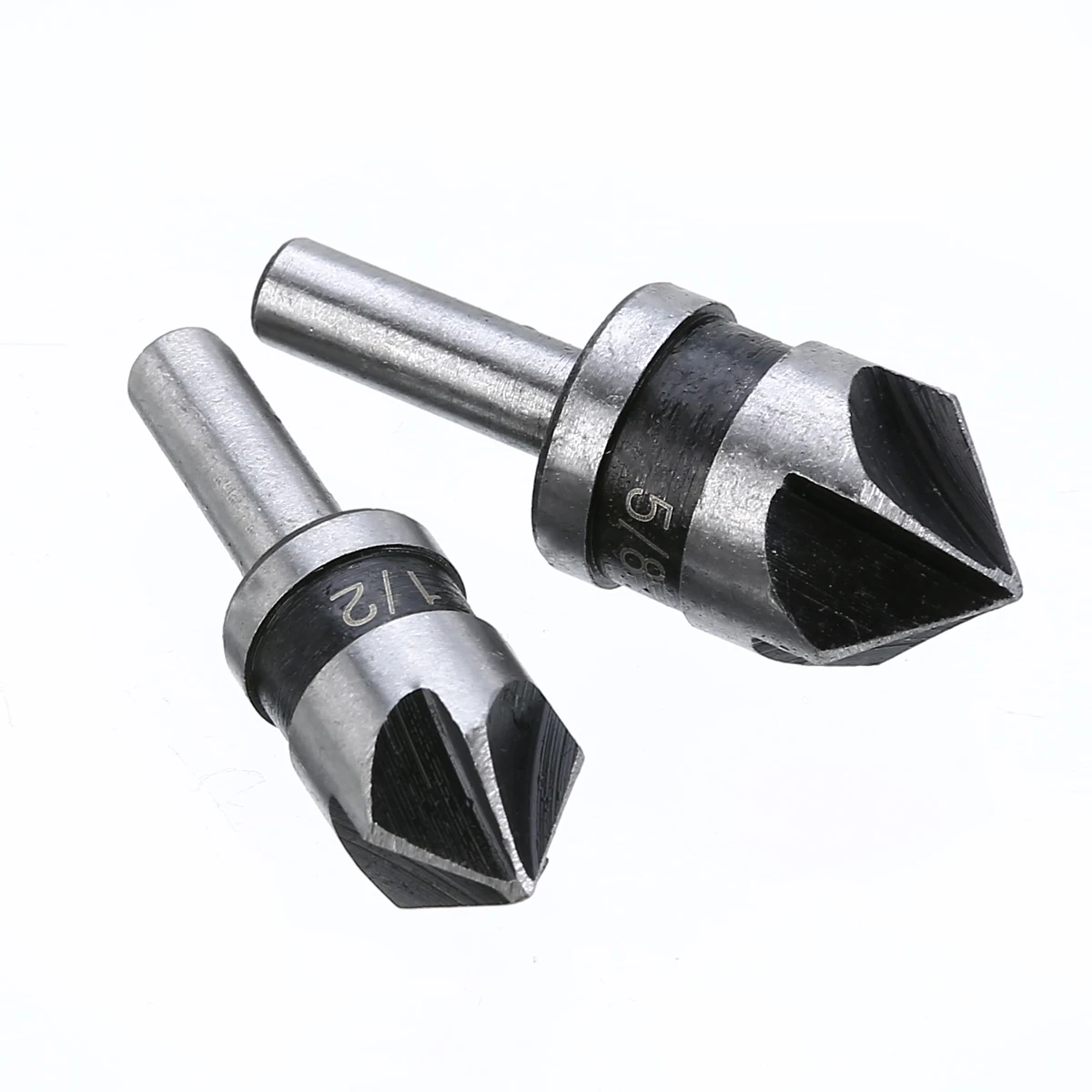 Achat Meilleur 2 pcs HSS 5 Flûte Fraise Foret 82 Degré Point Angle Chanfrein Chanfreinage Le Fraisage Cutter 1 4 \"Tige Ronde puissance Outil Pas Cher Prix.