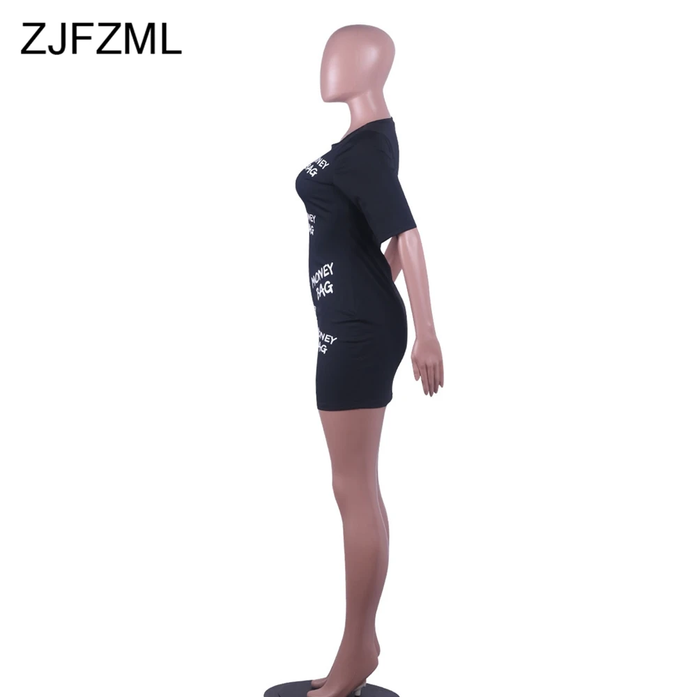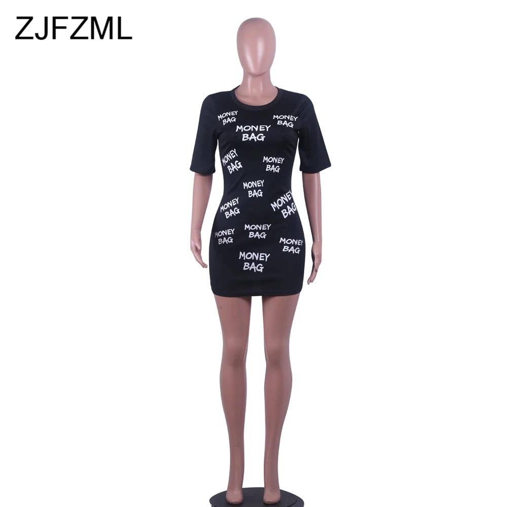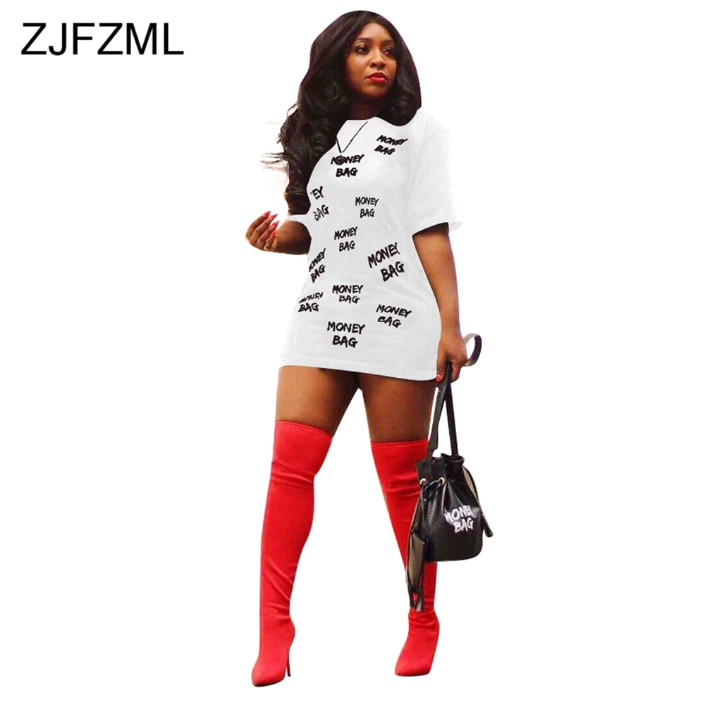 . Achat ZJFZML Lettre Imprimer Sexy T Chemise Robe 2018 New Demi Col Rond Manches Courtes Robe D été Noir Blanc Casual Mini robes Pas Cher En Ligne.