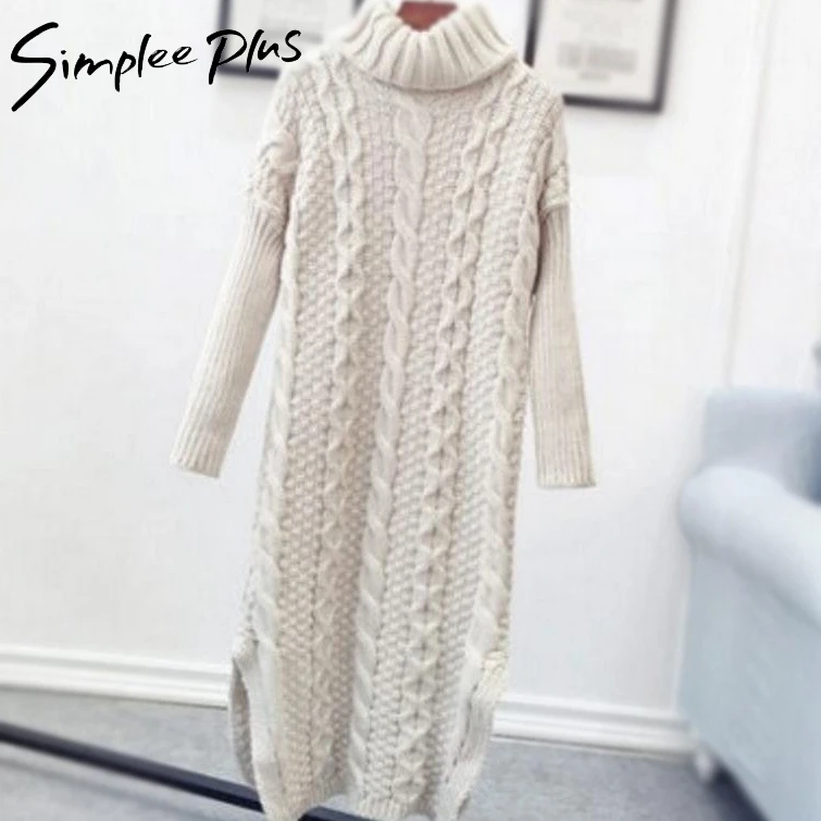 Achat Simplee Plus Hiver Femmes Chaud Robes Pull Grande Taille Doux Manche Longue Fendu Côté Décontracté Robe Col Roulé Longue Robe Tricotée Pas Cher En Ligne