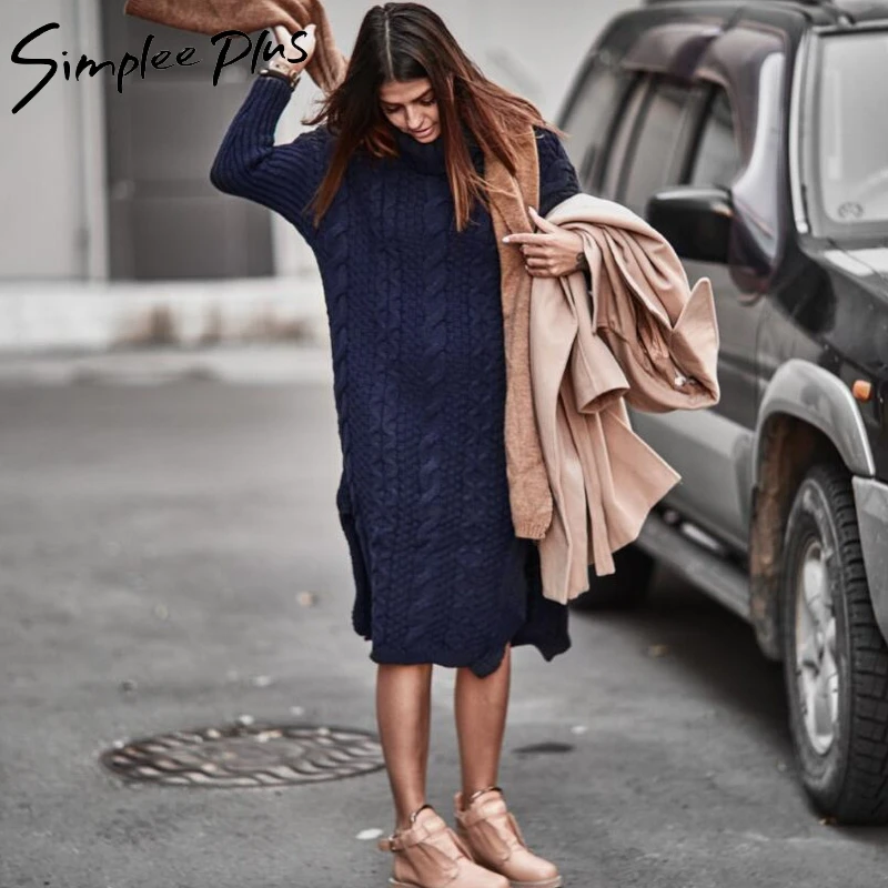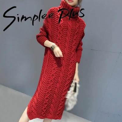 Acheter Meilleur Simplee Plus Hiver Femmes Chaud Robes Pull Grande Taille Doux Manche Longue Fendu Côté Décontracté Robe Col Roulé Longue Robe Tricotée Pas Cher Prix.