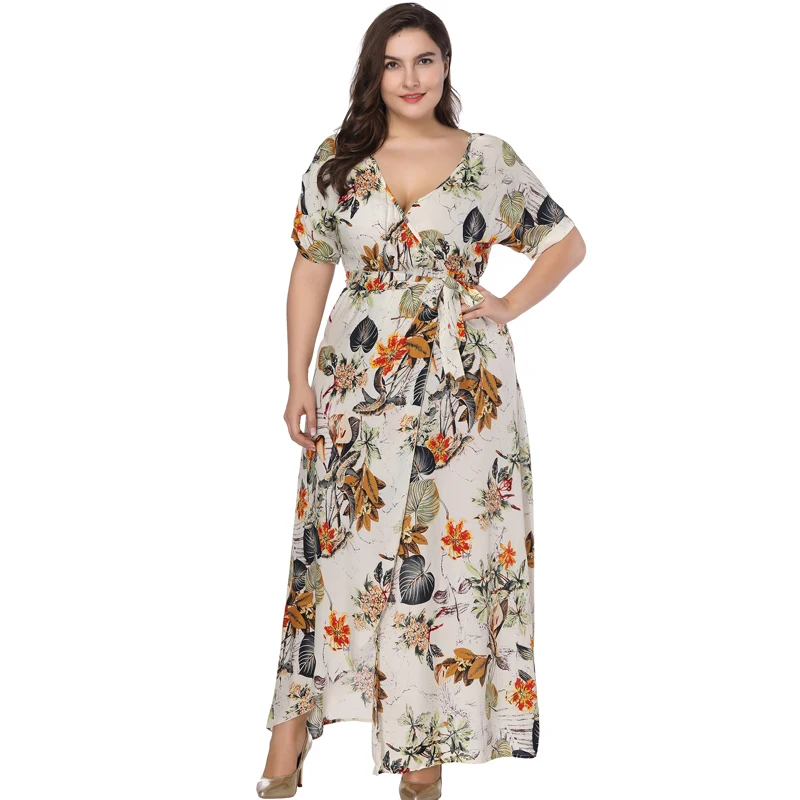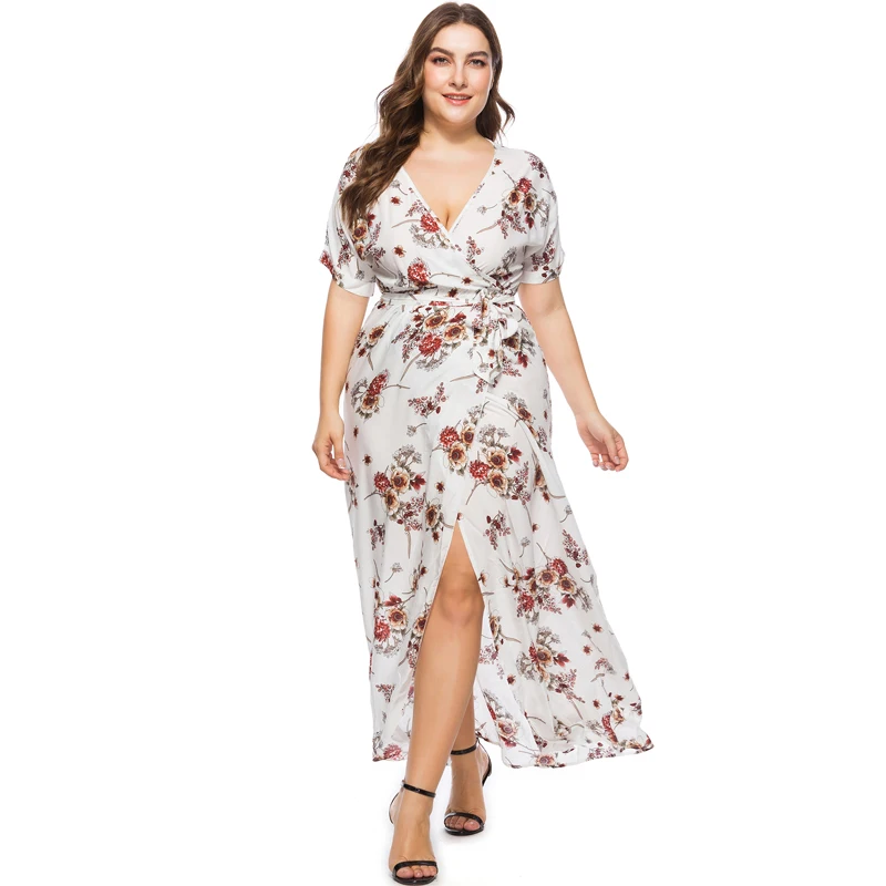Acheter Meilleur Plus la Taille Imprimé floral Boho Robe 2018 De Mode Femmes D été À Manches Courtes V Cou Wrap Robe Fendue Sexy Plage XL à 7XL Robe Pas Cher En Ligne.