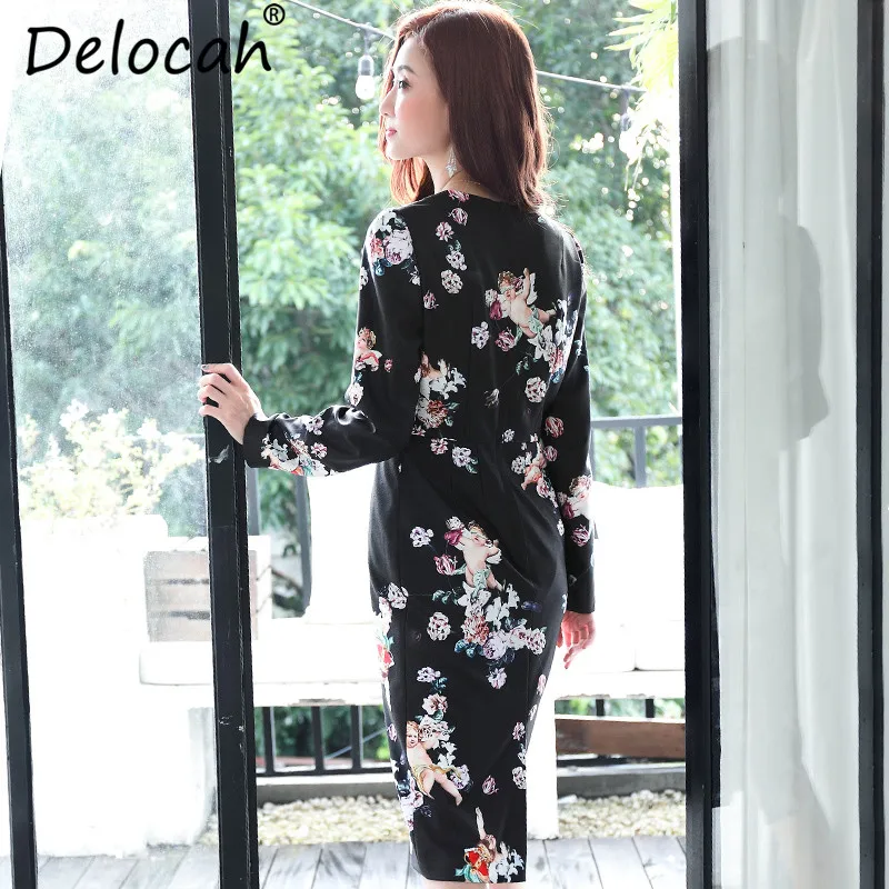 Acheter Delocah 2018 Nouveau Femmes Automne Robe Piste De Mode Designs Manches Longues Sexy Partie Ange Imprimé Floral Noir Midi Robe Élégante Pas Cher Prix