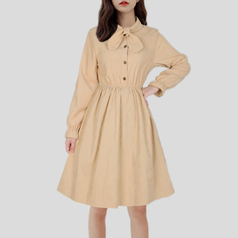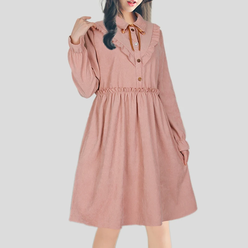 Vente Haute qualité vintage en velours côtelé à manches longues Turn down collar mori fille jaune rouge femmes robe automne hiver casual dames robes Pas Cher Prix