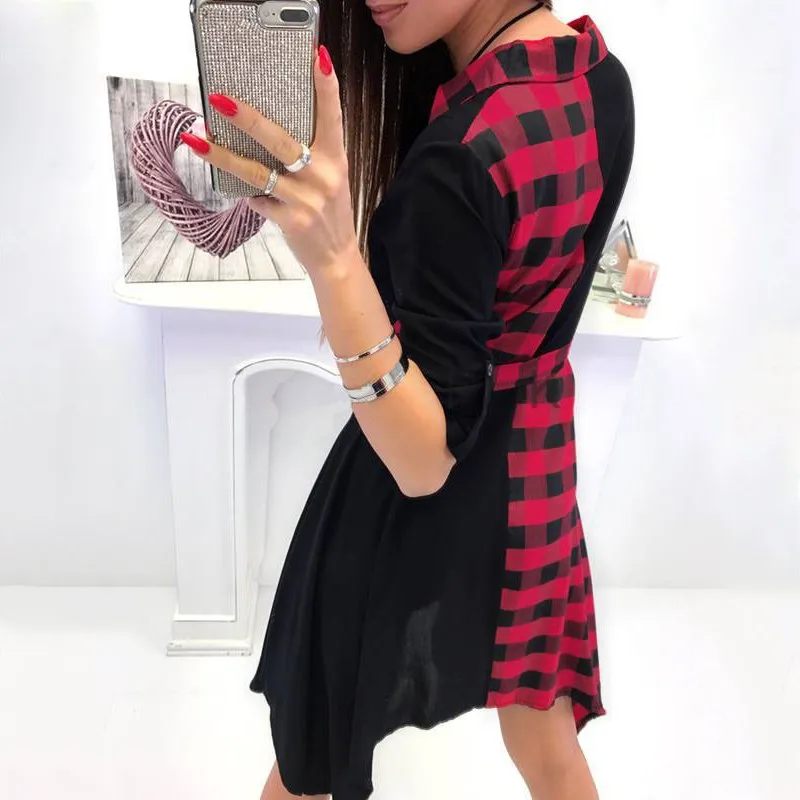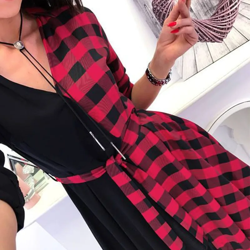 Achat Meilleur DeRuiLaDy 2018 Autum Hiver Plaid Patchwork Irrégulière Robe Femmes V Cou À Manches Longues Robes Femmes Casual Rétro Robe Robes Pas Cher Prix.