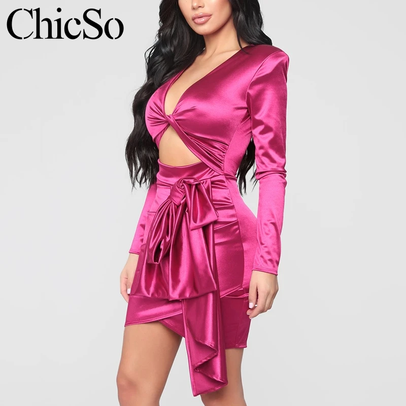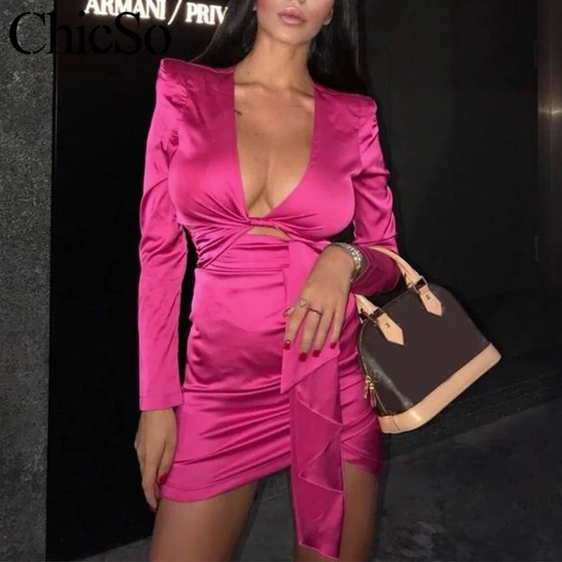 . Acheter MissyChilli Partie bandage satin sexy robe Femmes v cou club rose automne robe Féminine fluorescence courte élégante robe robes Pas Cher En Ligne.