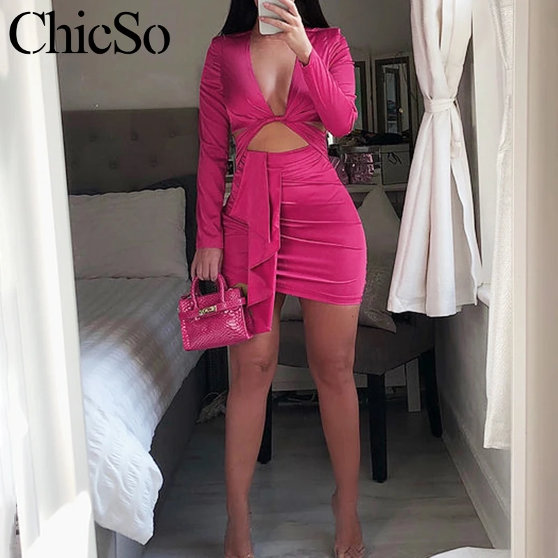 Achat MissyChilli Partie bandage satin sexy robe Femmes v cou club rose automne robe Féminine fluorescence courte élégante robe robes Pas Cher Prix