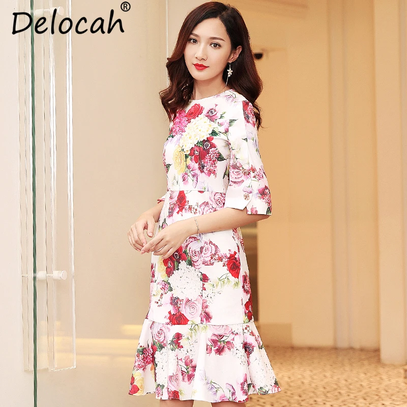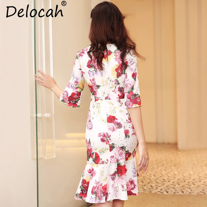 . Acheter Delocah Automne Casual Femmes Robe Piste Créateur De Mode Mince Élégante Fleur Imprimer Moulante Sexy Sirène Robes de Soirée robes Pas Cher En Ligne.