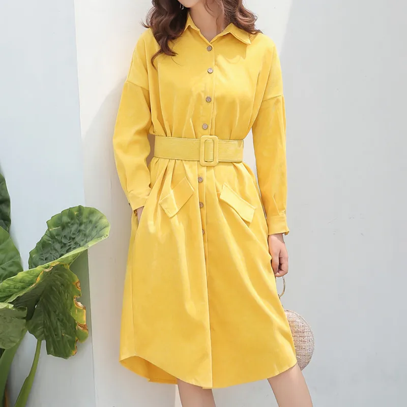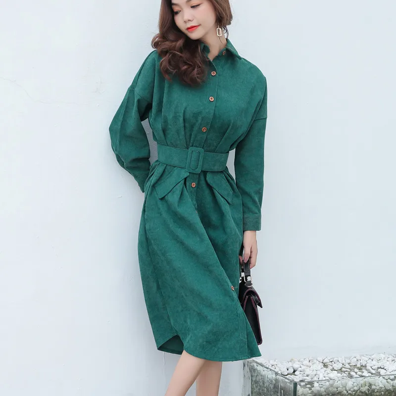 Achat Meilleur Nouveau 2018 Automne Hiver Velours Côtelé Chemise Robe Femmes Chemisier Chemise Robe Vintage Large Ceinture Lâche Robes Robes Robe Féminine Pas Cher En Ligne.