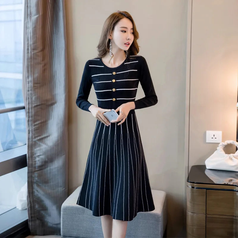 Vente Meilleur Automne À Tricoter A ligne Robe 2018 Femmes Rayé Pleine Manches O cou Élégant Office Lady Parti Midi Robe Vintage Robes pour le Travail Pas Cher En Ligne.