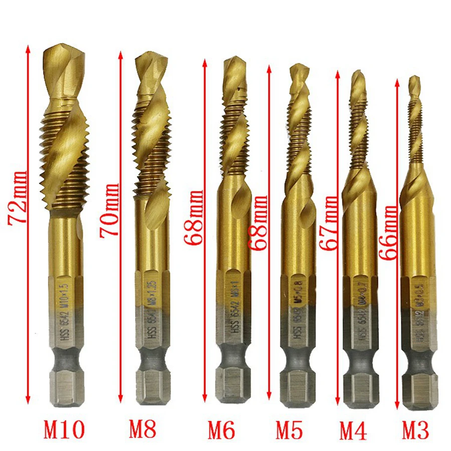 Acheter Meilleur 6 pcs Titane M2 Main Tap Drill Bits Hex Shank HSS Vis Spirale Fil Point Métrique Plug M3 M4 M5 m6 M8 M10 fit Métal Acier Pas Cher En Ligne.