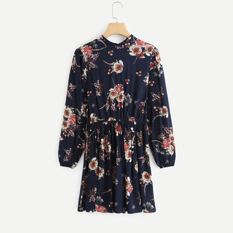 Acheter Meilleur Automne Floral Femmes Robes Multicolore Élégant À Manches Longues Taille Haute UNE Ligne Chic Robe Dames Cravate Cou Robe Vintage Mini robe Pas Cher Prix.