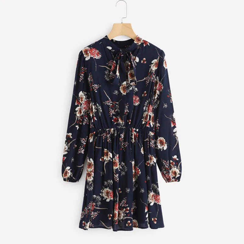 Vente Automne Floral Femmes Robes Multicolore Élégant À Manches Longues Taille Haute UNE Ligne Chic Robe Dames Cravate Cou Robe Vintage Mini robe Pas Cher En Ligne