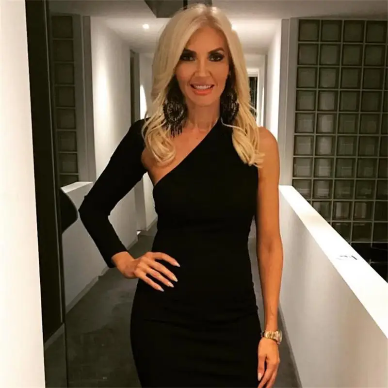 . Achat InstaHot Un Manches Genou Longueur Robe Femmes Automne Noir Scoop Retour Une Épaule Robes Élégant Femelle Sexy Club Slim Skinny Pas Cher En Ligne.